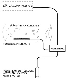 Haluttaessa voidaan käyttää lisäksi huonetilaan asennettua suhteellisen kosteuden anturia VE-82, joka ennakoi kondensoitumisen mahdollisuuden pudottamalla jäähdytystehoa ja VE-5 varmistaa esimerkiksi pysäyttämällä jäähdytyksen hetkeksi kokonaan. Tällöin käytetään jänniteulostulolla varustettua Vetester12. |